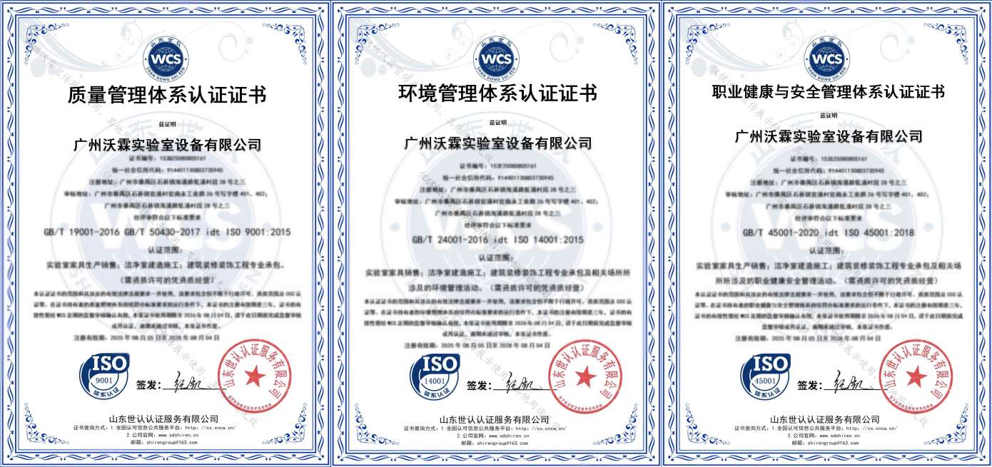 沃霖实验室是洁净行业优秀施工建造企业,拥有建筑装修工程专业承包二级、电子与智能化工程专业承包二级、环保工程专业承包二级、建筑机电安装工程专业承包二级等资质。先后通过ISO9001:2015、ISO14001:2015、ISO45001:2018 认证,知识产权管理体系认证,拥有多项发明专利、二十余项实用型专利及十余项软件著作专利。